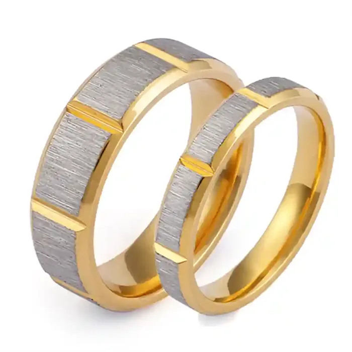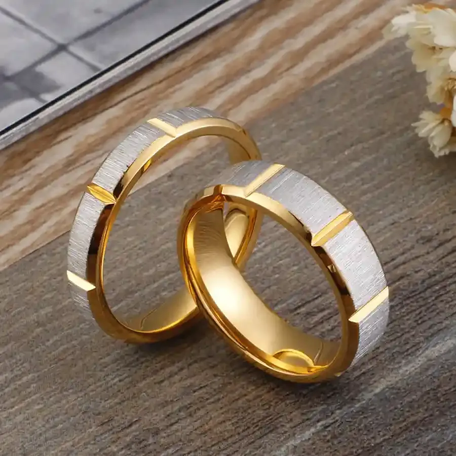 Den matterede overflade skaber en flot kontrast til de blanke, forgyldte detaljer, hvilket giver ringen karakter og dybde uden at virke prangende. Designet er enkelt, men gennemtænkt – perfekt som både forlovelsesring og vielsesring.