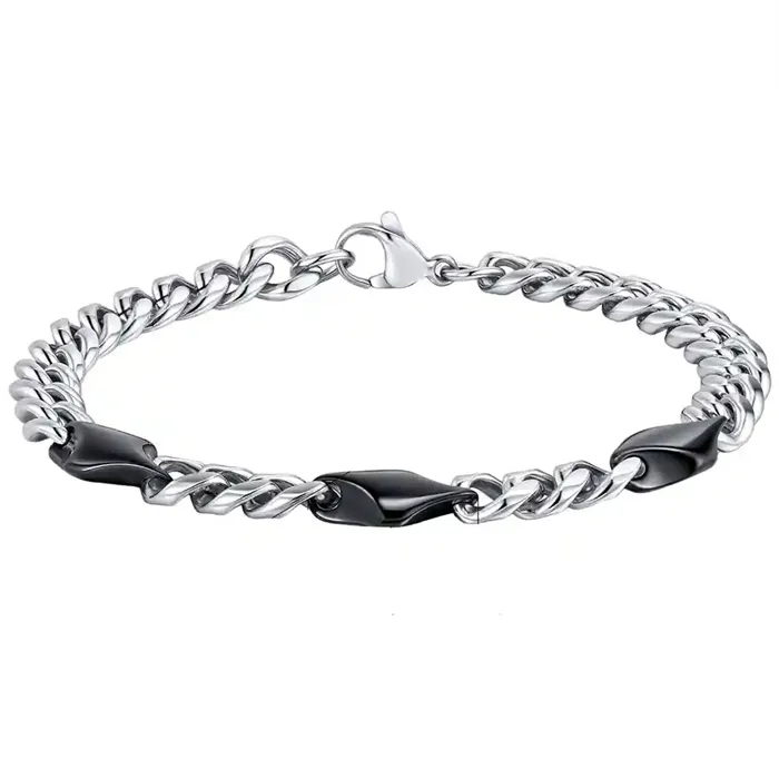Herrearmbånd der kombinerer et klassisk kædedesign i rustfrit stål med sorte agat detaljer, der giver armbåndet et råt og moderne udtryk. Kontrasten mellem det blanke stål og de sorte, glatte elementer skaber et markant look, som passer perfekt til den stilbevidste mand.