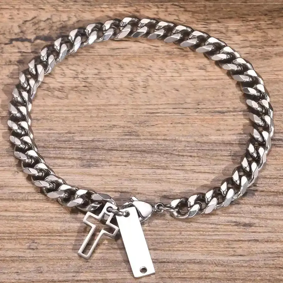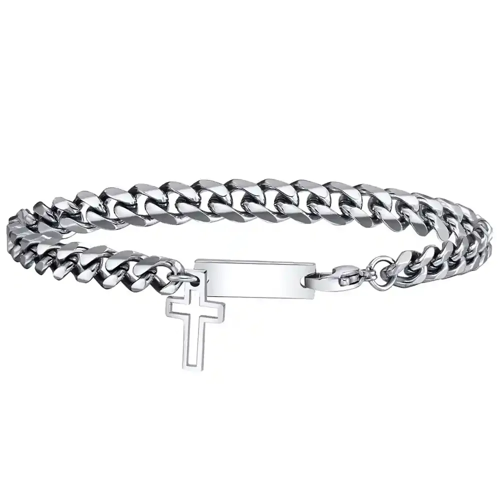 Kraftfuldt og stilrent herrearmbånd i rustfrit stål med et klassisk korsvedhæng.