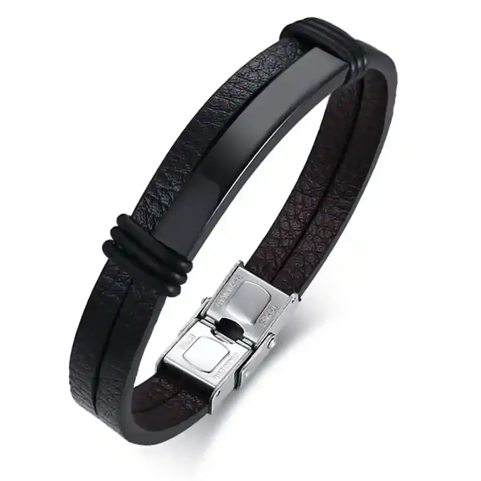 Dette herrearmbånd kombinerer ægte sort læder med et bånd i sort PVD-belagt rustfrit stål – et markant og maskulint look, der udstråler styrke og attitude. Overfladen har en dyb blackcoat-finish, som giver et eksklusivt og moderne udtryk.