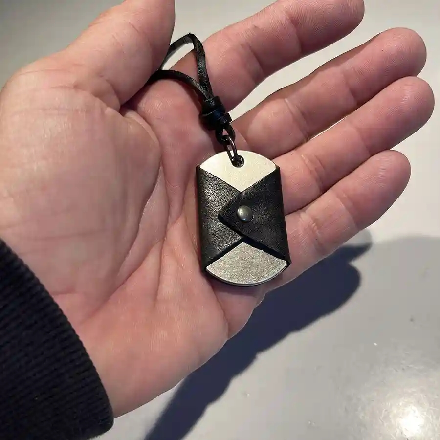 Vedhænget måler 2.5x4.5 cm og lædersnoren er variabel op til 70 cm.