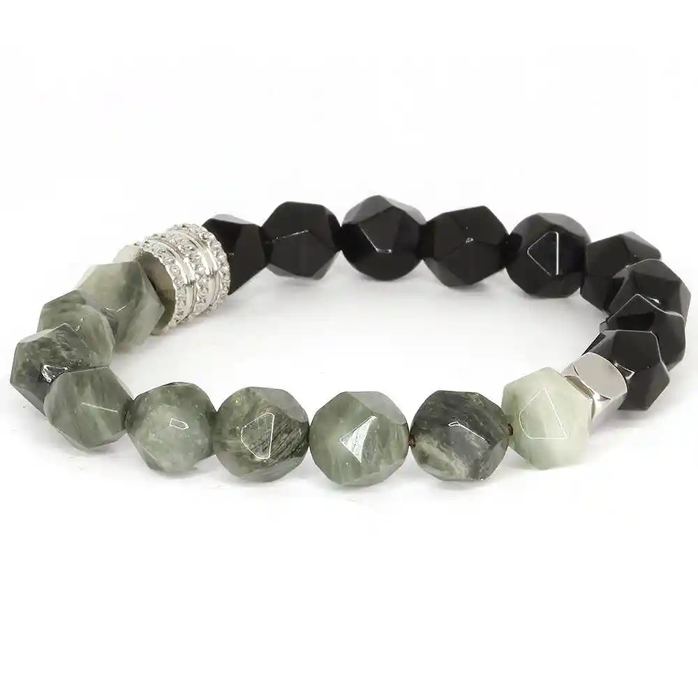Armbåndet er håndlavet med 10 mm facetterede grønne natursten og sorte agatperler, der symboliserer balance, styrke og harmoni.