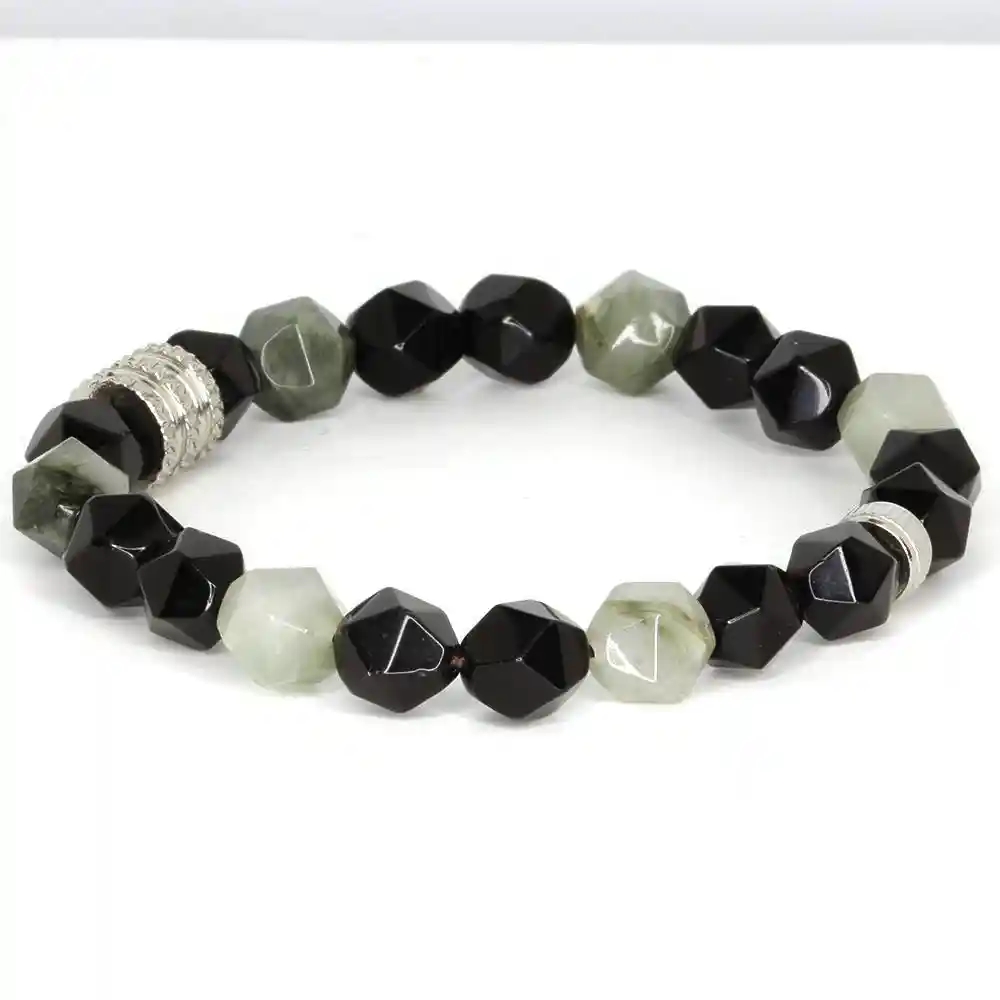 Kombinationen af dybsorte agatperler og 10 mm facetterede grønne natursten skaber et unikt samspil mellem styrke og ro.
