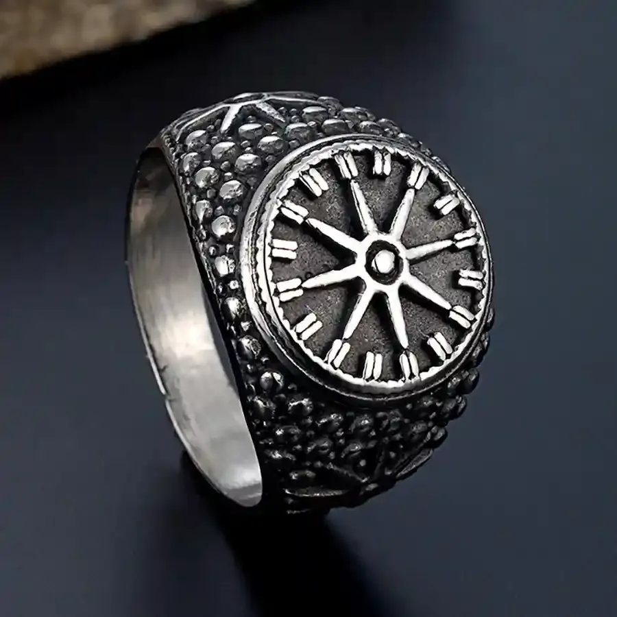 Denne bikerring i rustfri 316L stål er skabt til manden, der går sine egne veje. Det markante kompasdesign symboliserer retning, styrke og frihed – perfekt til den ægte biker eller den stilbevidste mand med kant.