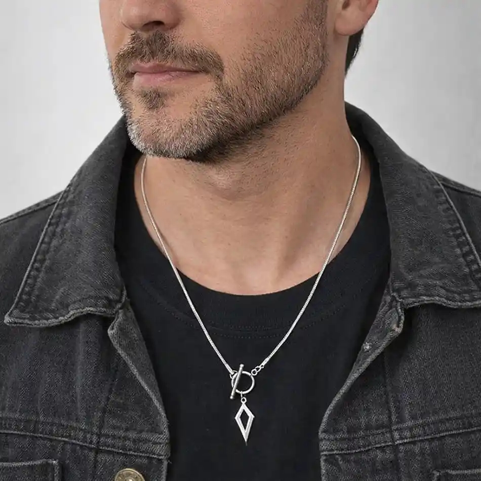 Vedhænget måler ca. 2,4 cm i længden og 1,1 cm i bredden, hvilket giver et diskret men karakterfuldt udtryk. Halskæden har en længde på ca. 50 cm, som passer perfekt til et klassisk herrelook.