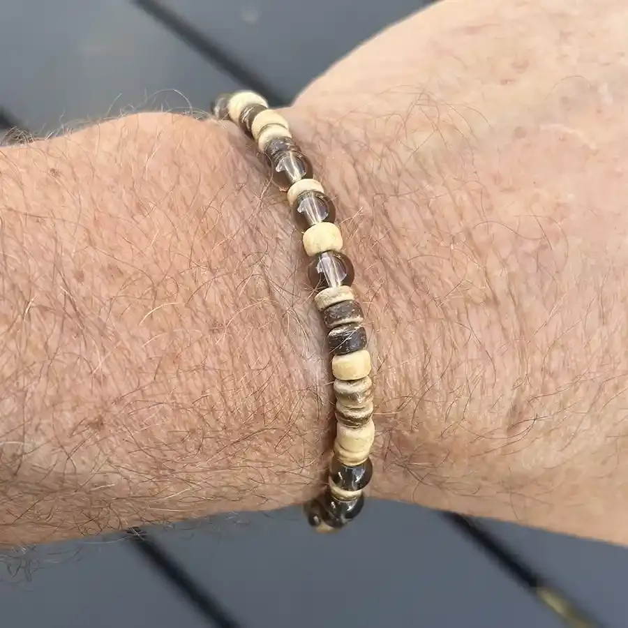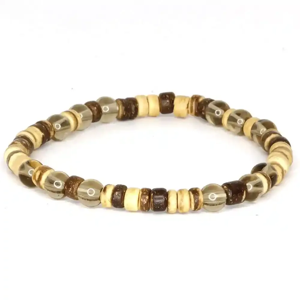 Herrearmbånd designet med naturlige kokosperler og ægte quartz sten i 6 mm tykkelse.