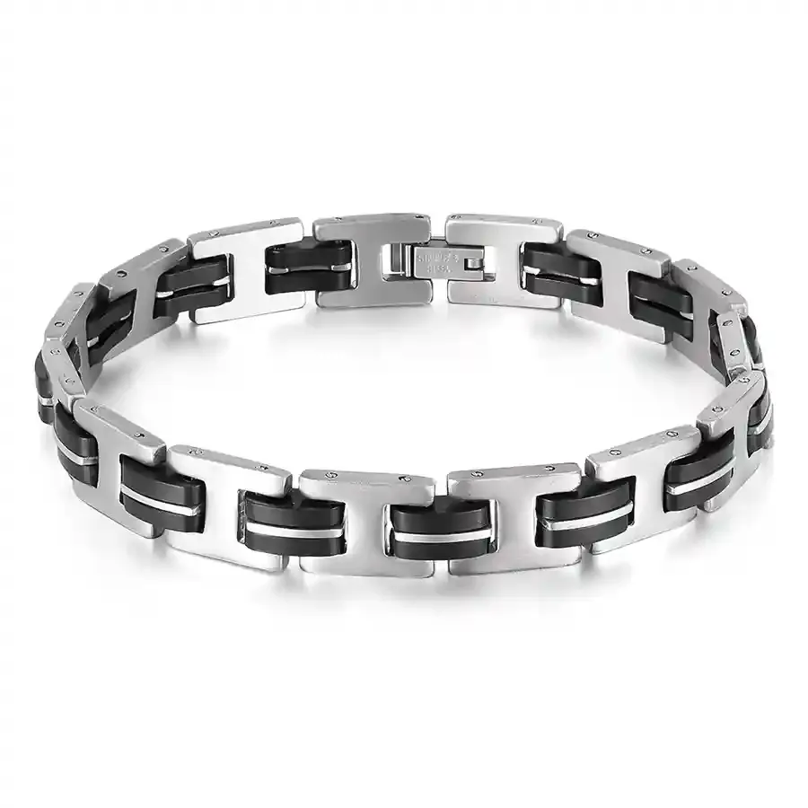 Et stilrent og maskulint armbånd til mænd, fremstillet i rustfrit stål og sort silikone.