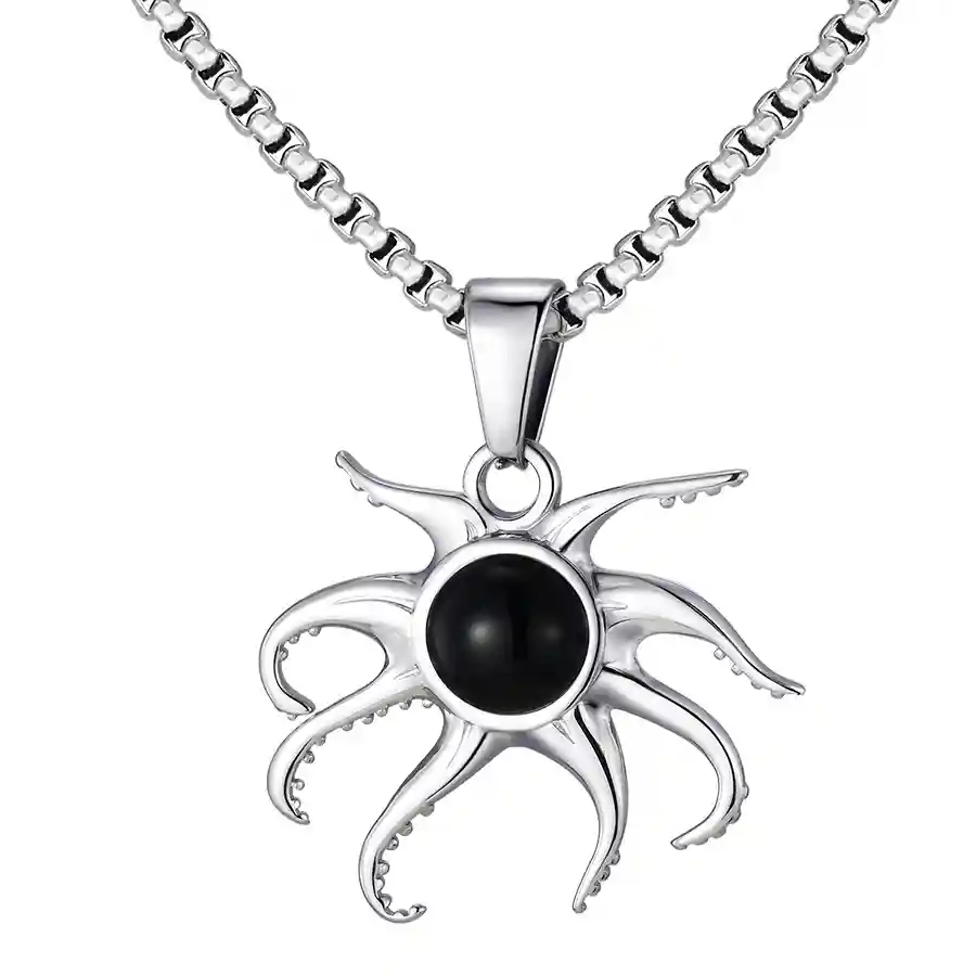 Herrehalskæden her kombinerer rå styrke og detaljeret design i ét iøjnefaldende smykke. Vedhænget er formet som en kraftfuld blæksprutte med snoede arme og en dybsort sten i midten, der tilfører et mørkt og maskulint udtryk.