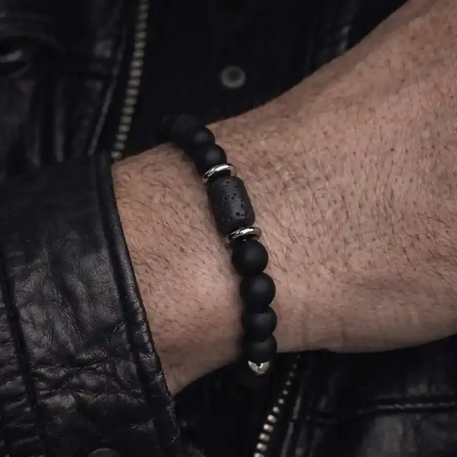 Sort perlearmbånd til mænd kombinerer 8mm blackstone-perler, rå lavaperler og blanke hematitdetaljer i et stilrent og maskulint design. Kontrasten mellem de matte sten og de polerede metalperler giver armbåndet et eksklusivt, men råt udtryk – perfekt til den moderne mand.