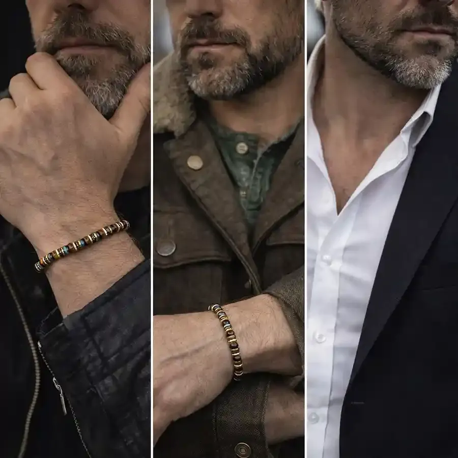 Dette elegante herrearmbånd med tiger eye sten kombinerer maskulint design med naturlig stil. De flotte 7 mm sten i varme brune og gyldne nuancer giver armbåndet et eksklusivt udtryk, mens de polerede stålled skaber et moderne og stilrent look.