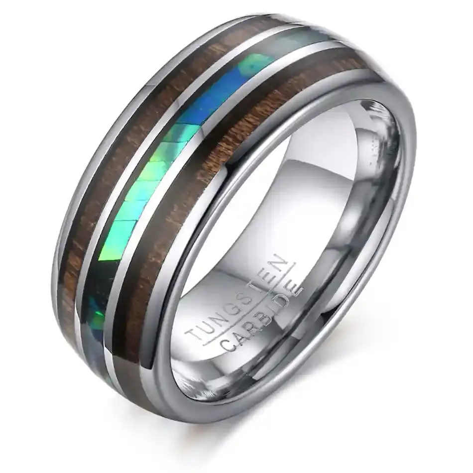 Med indlæg af ægte Hawaiian Koa-træ og skinnende abalone-skal får ringen et unikt spil mellem varme, dybe trætoner og iriserende blågrønne nuancer.