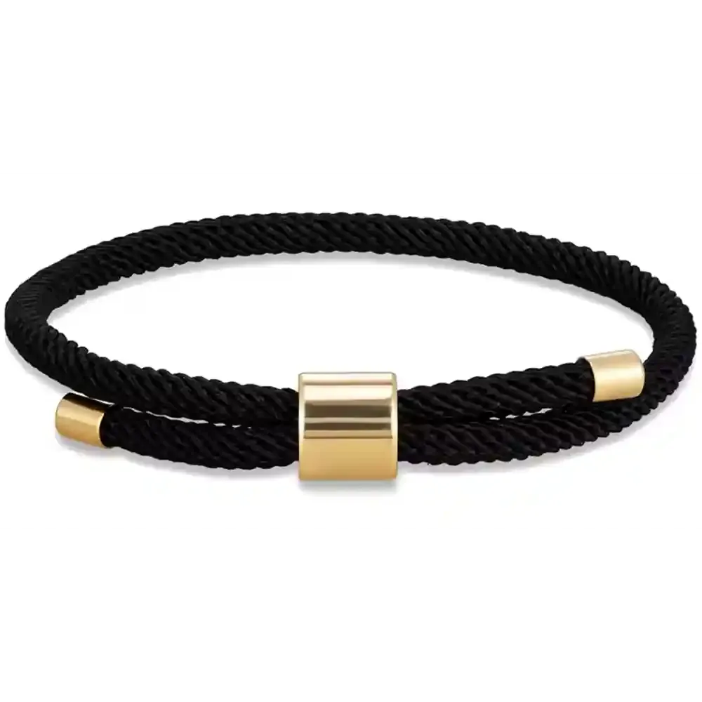 Et tidløst og maskulint herrearmbånd, der kombinerer sort flettet bomuldssnor med forgyldt ædelstål for et elegant og råt udtryk.